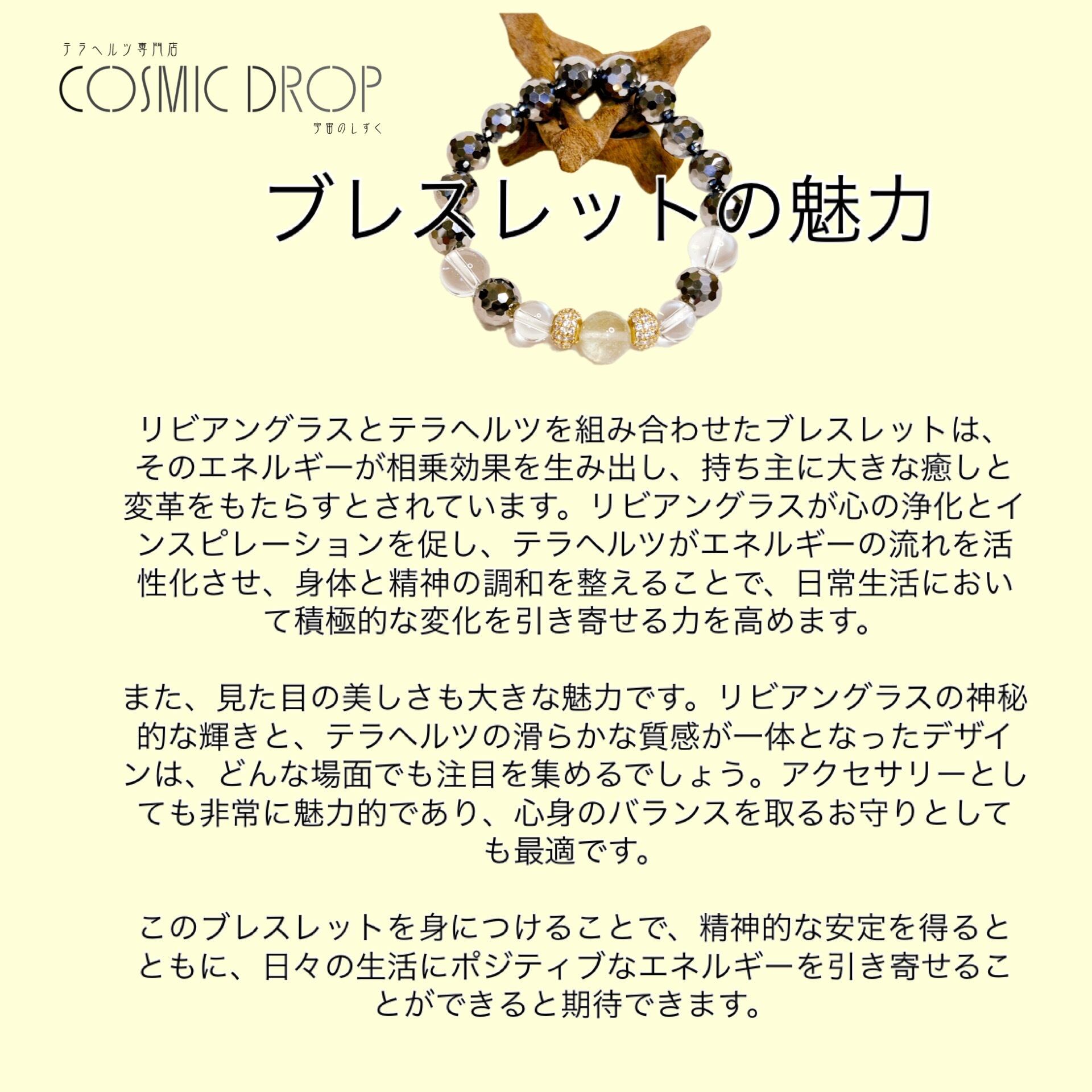リビアングラスとテラヘルツを組み合わせたブレスレットは、そのエネルギーが相乗効果を生み出し、持ち主に大きな癒しと変革をもたらすとされています。リビアングラスが心の浄化とインスピレーションを促し、テラヘルツがエネルギーの流れを活性化させ、身体と精神の調和を整えることで、日常生活において積極的な変化を引き寄せる力を高めます。